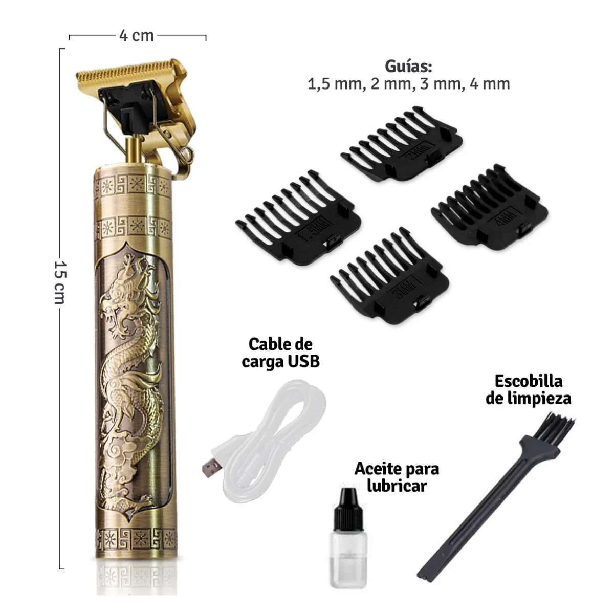 Guías (peines): 1,5 mm, 2 mm, 3 mm y 4 mm.